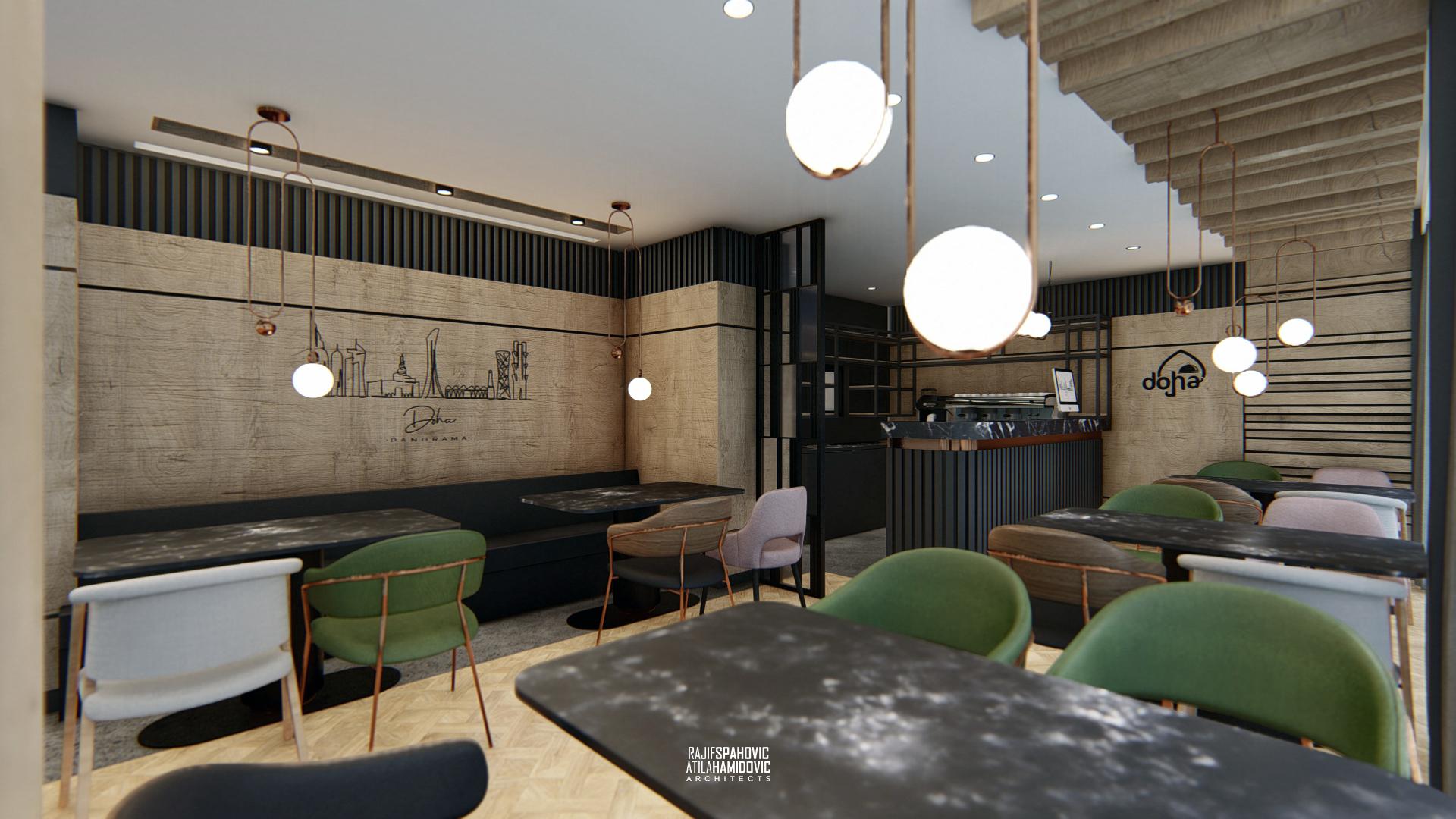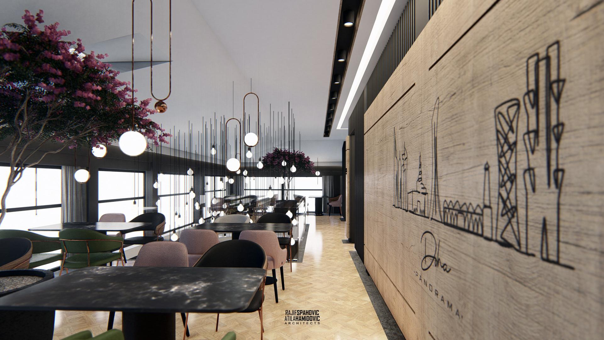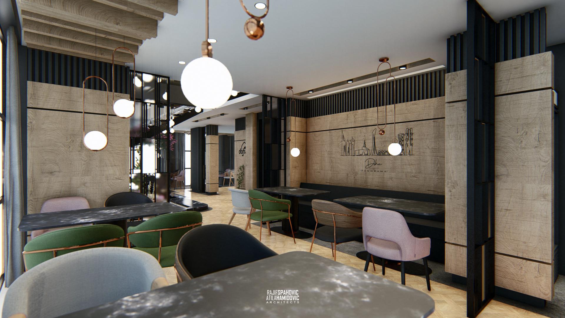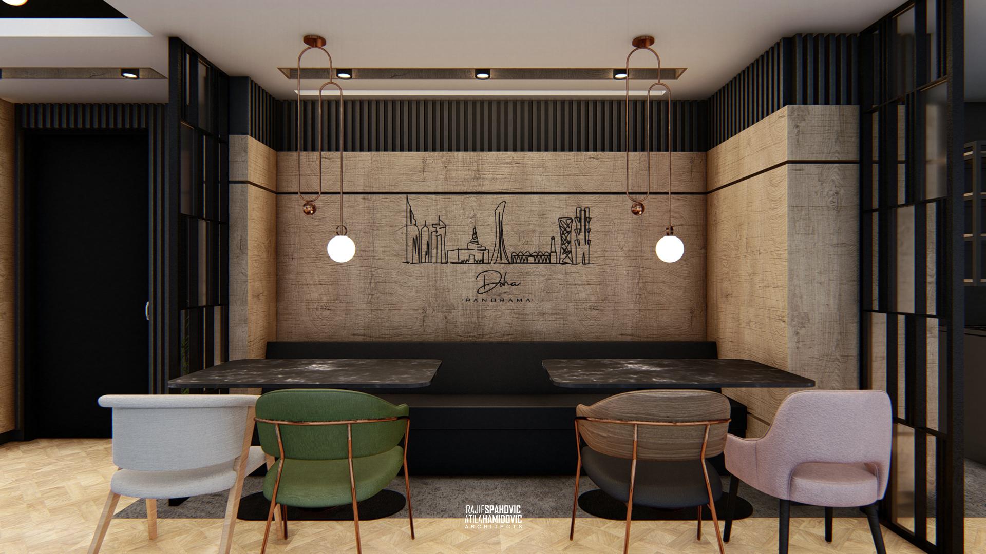 DOHA PANORAMA is a cafe / restaurant located in Novi Pazar on the top of the building roof, in the Republic of Serbia. It is conceptualized as a cafe/restaurant and features a modern interior design with a combination of wooden, stone and steel elements.