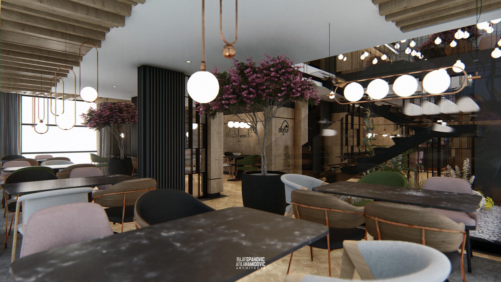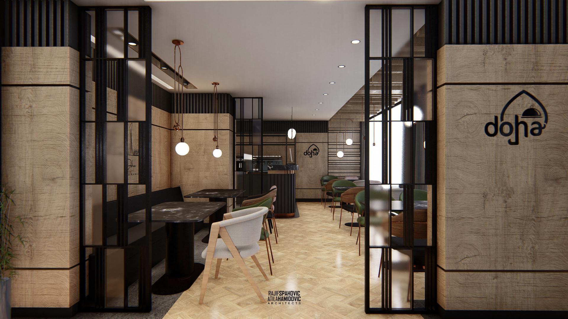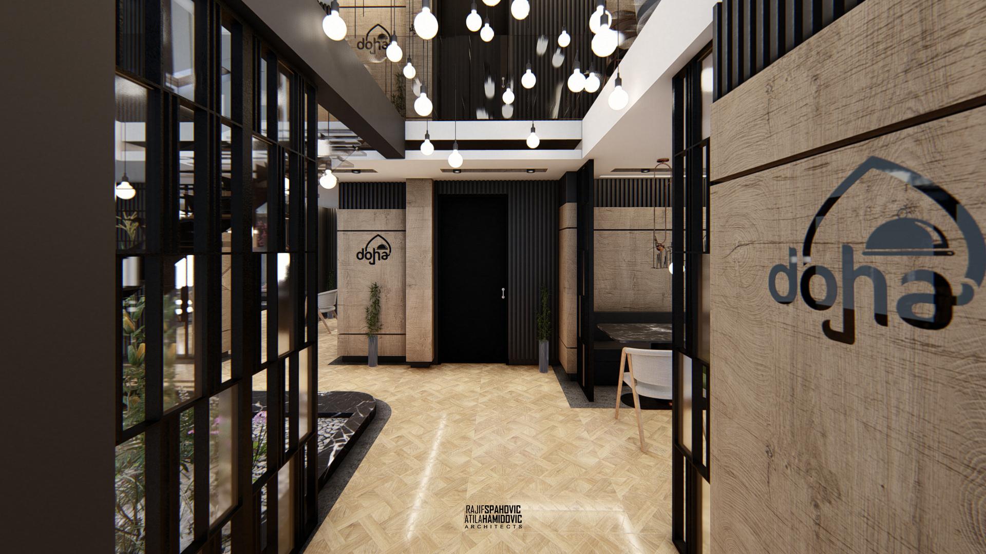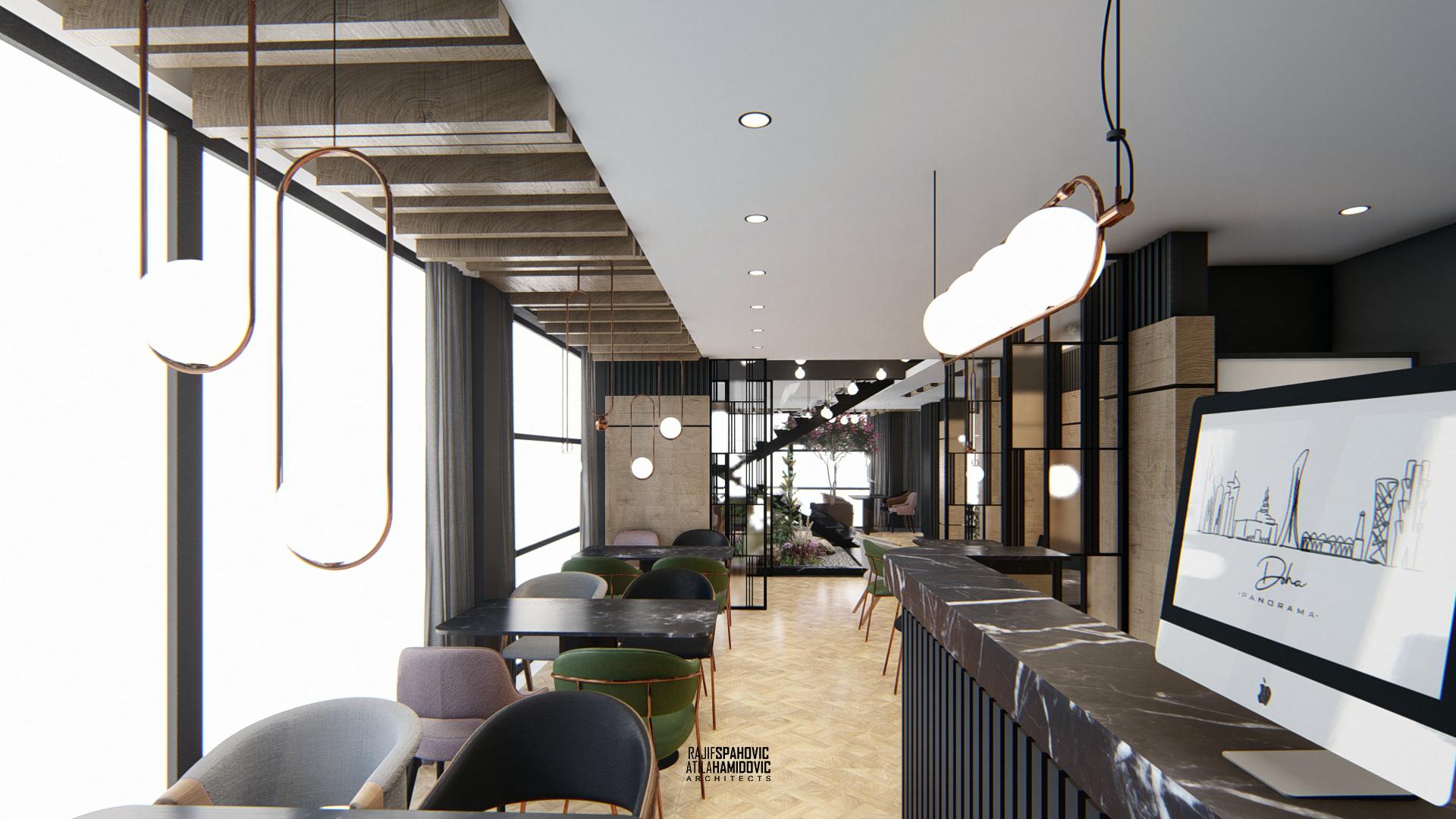 DOHA PANORAMA is a cafe / restaurant located in Novi Pazar on the top of the building roof, in the Republic of Serbia. It is conceptualized as a cafe/restaurant and features a modern interior design with a combination of wooden, stone and steel elements.