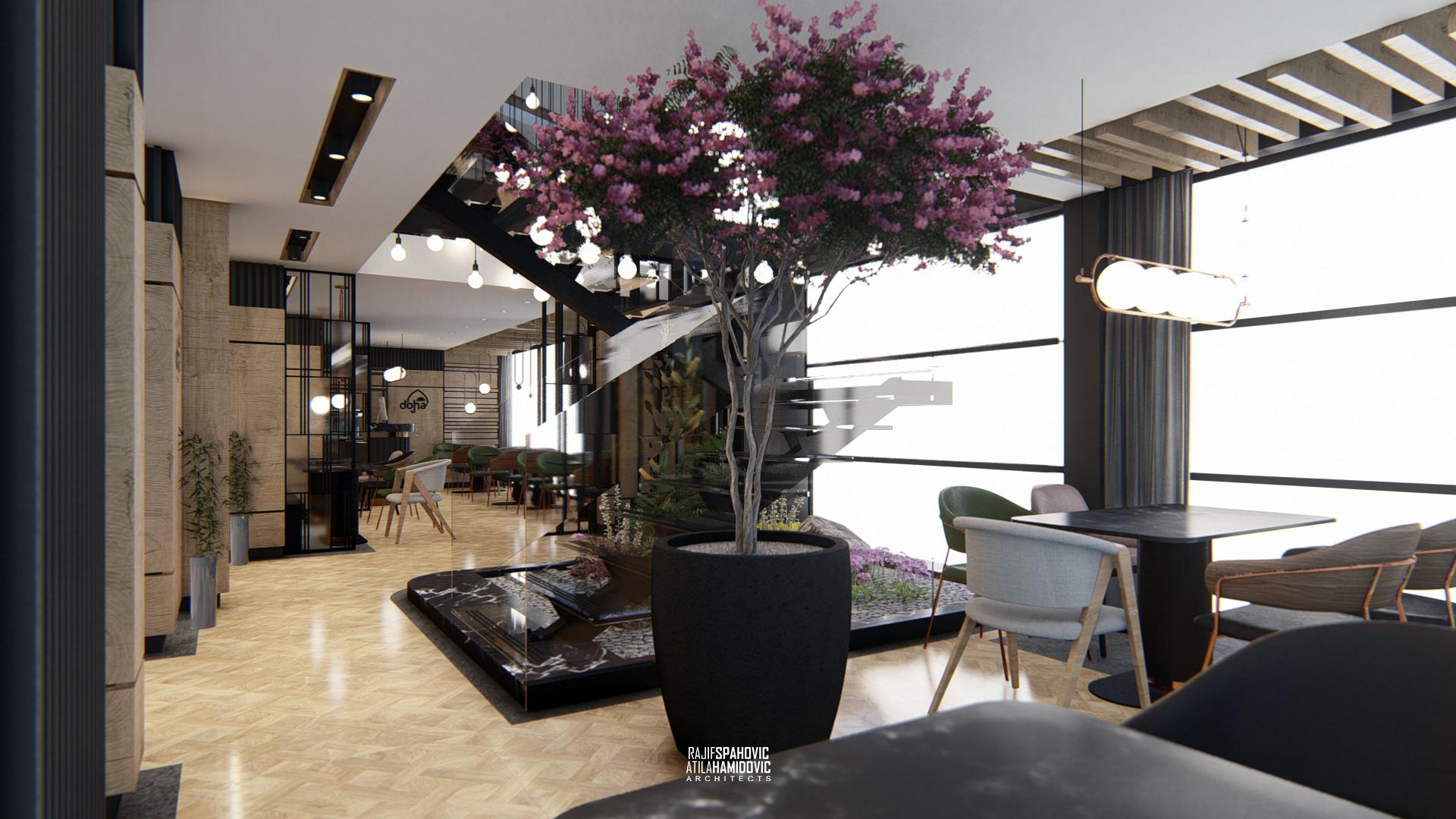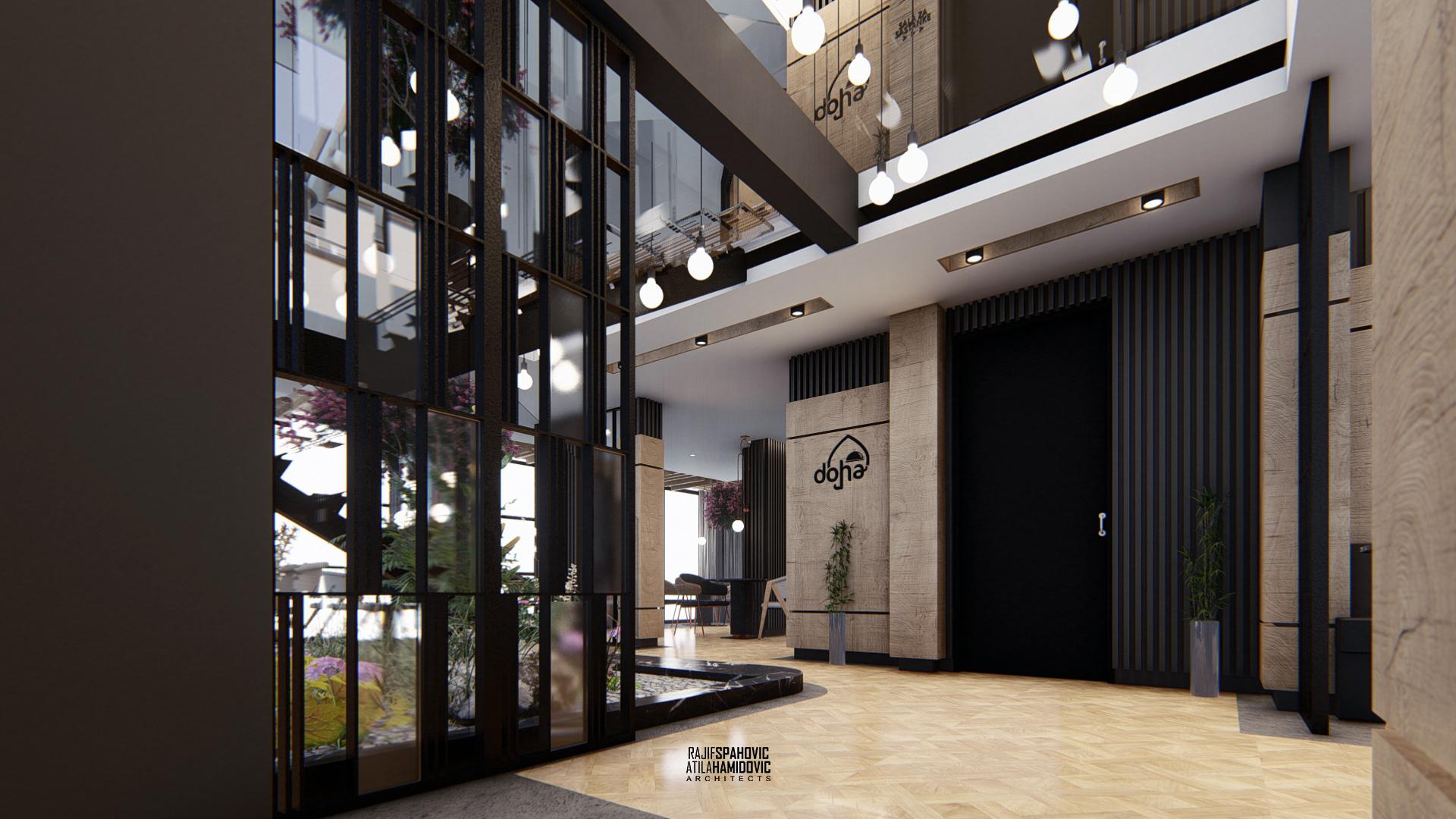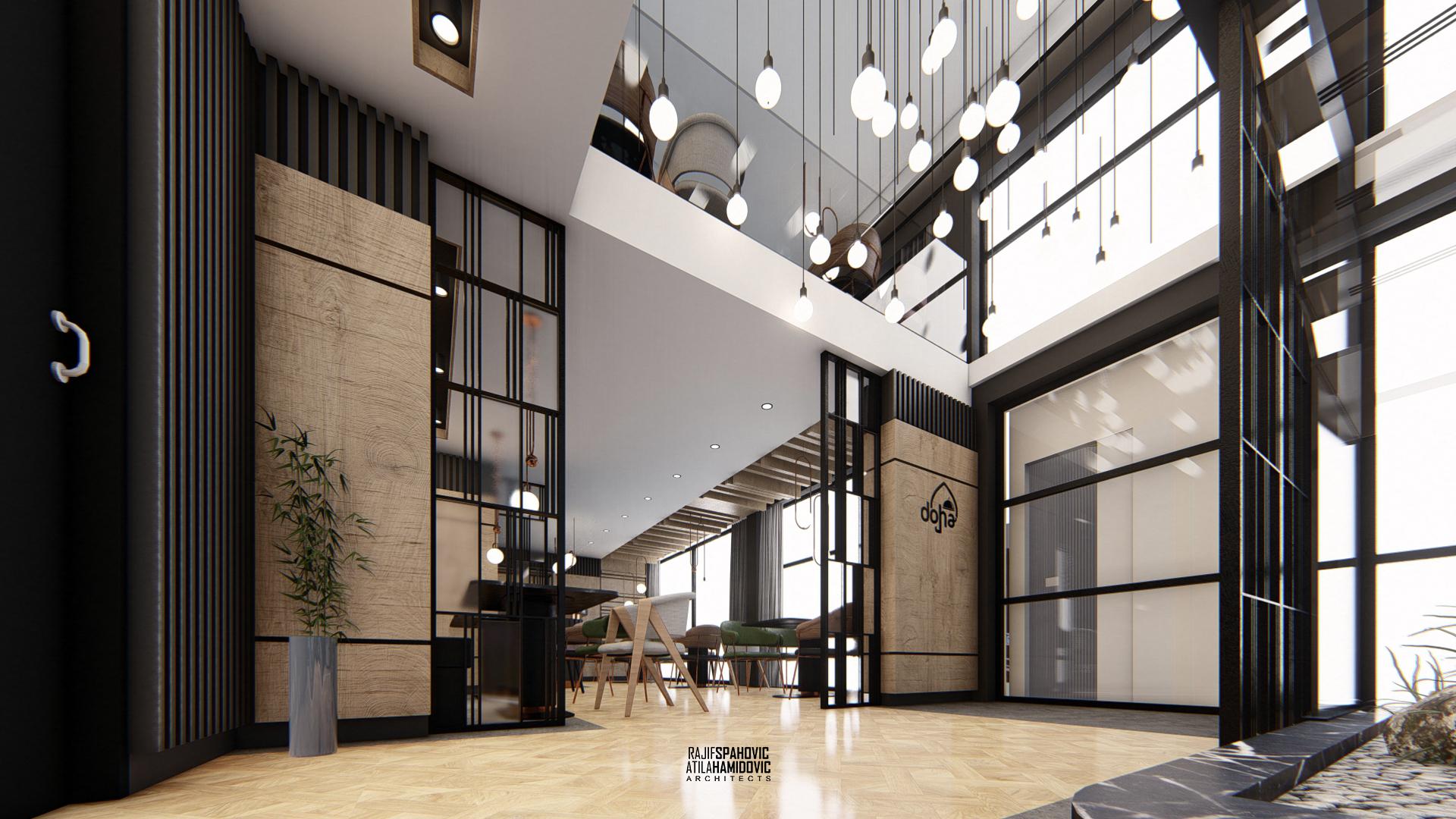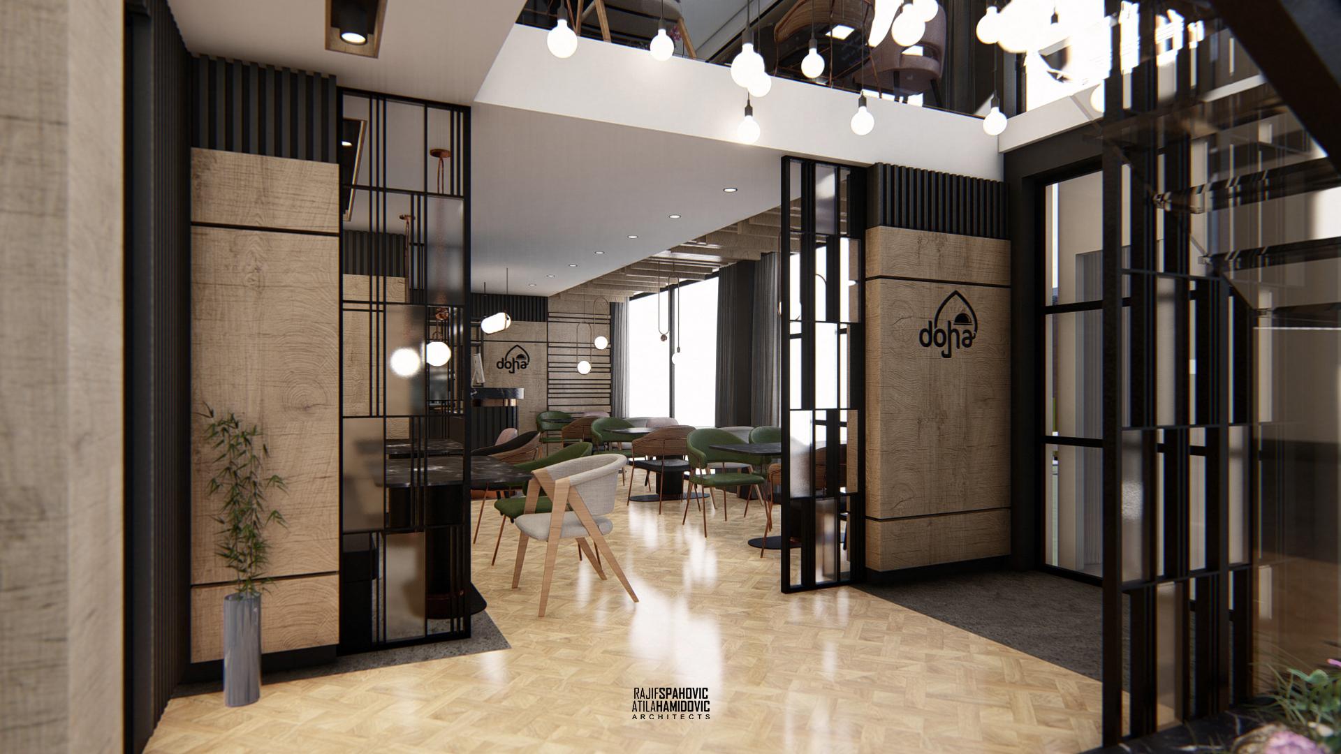 DOHA PANORAMA is a cafe / restaurant located in Novi Pazar on the top of the building roof, in the Republic of Serbia. It is conceptualized as a cafe/restaurant and features a modern interior design with a combination of wooden, stone and steel elements.