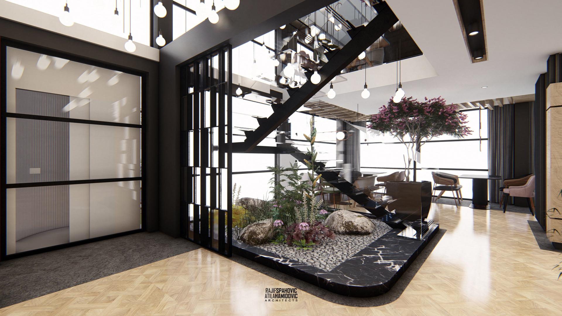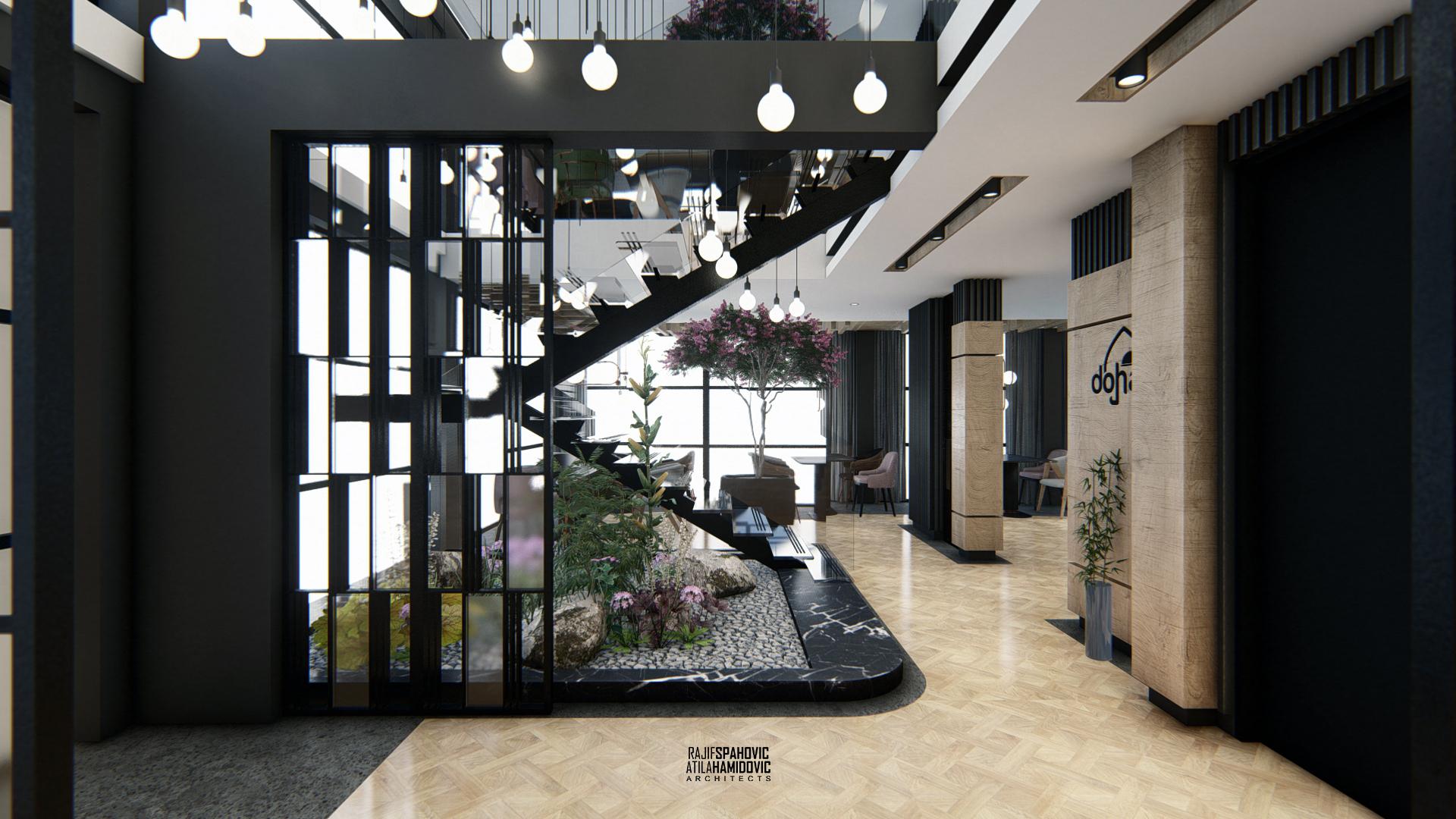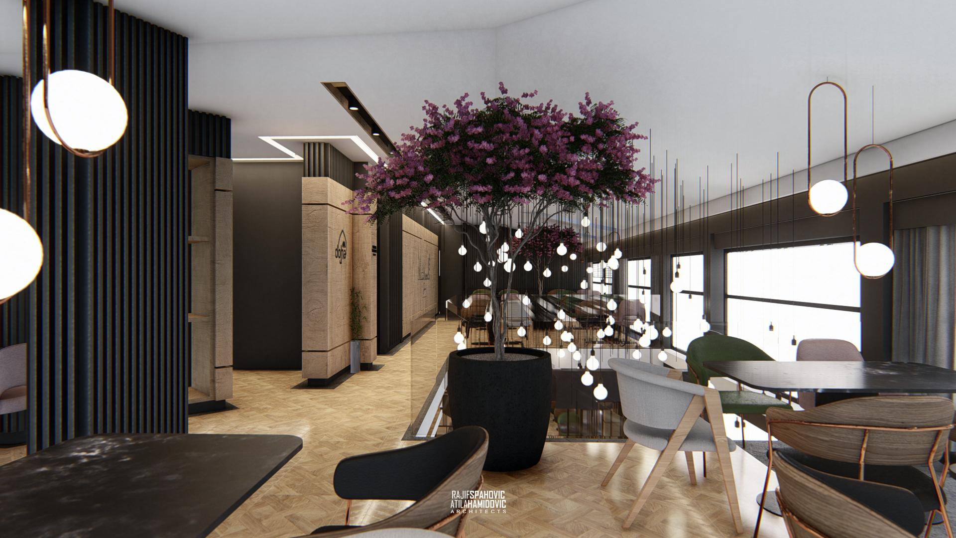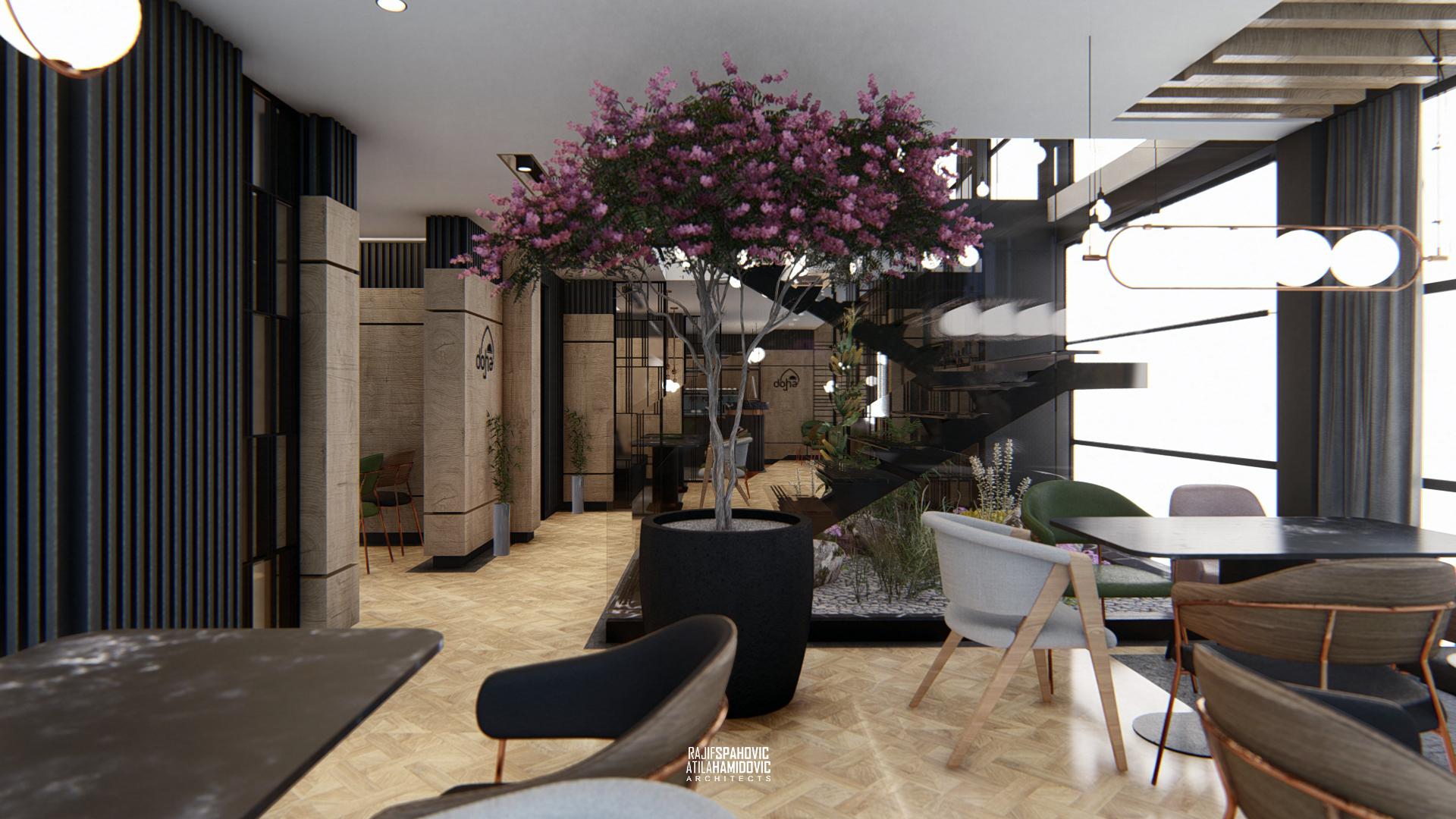DOHA PANORAMA is a cafe / restaurant located in Novi Pazar on the top of the building roof, in the Republic of Serbia. It is conceptualized as a cafe/restaurant and features a modern interior design with a combination of wooden, stone and steel elements.
