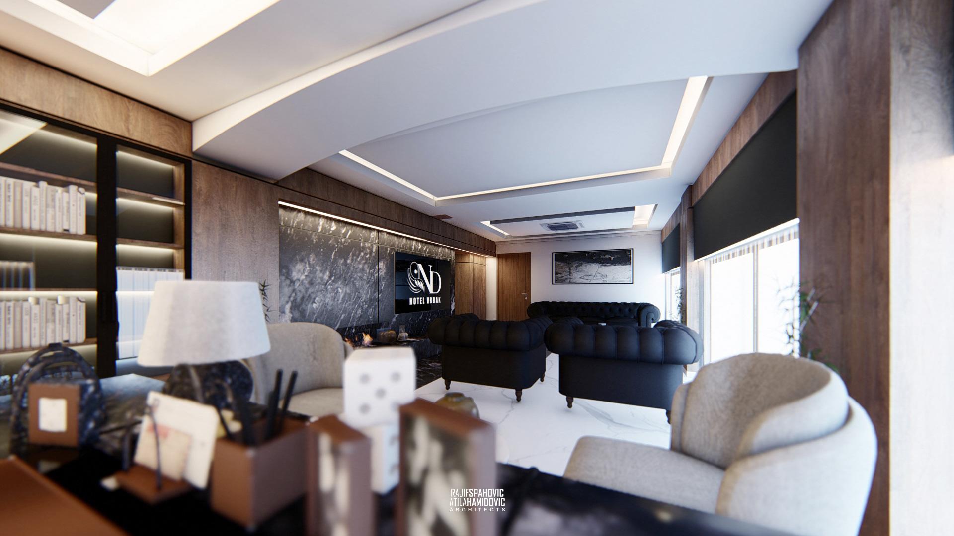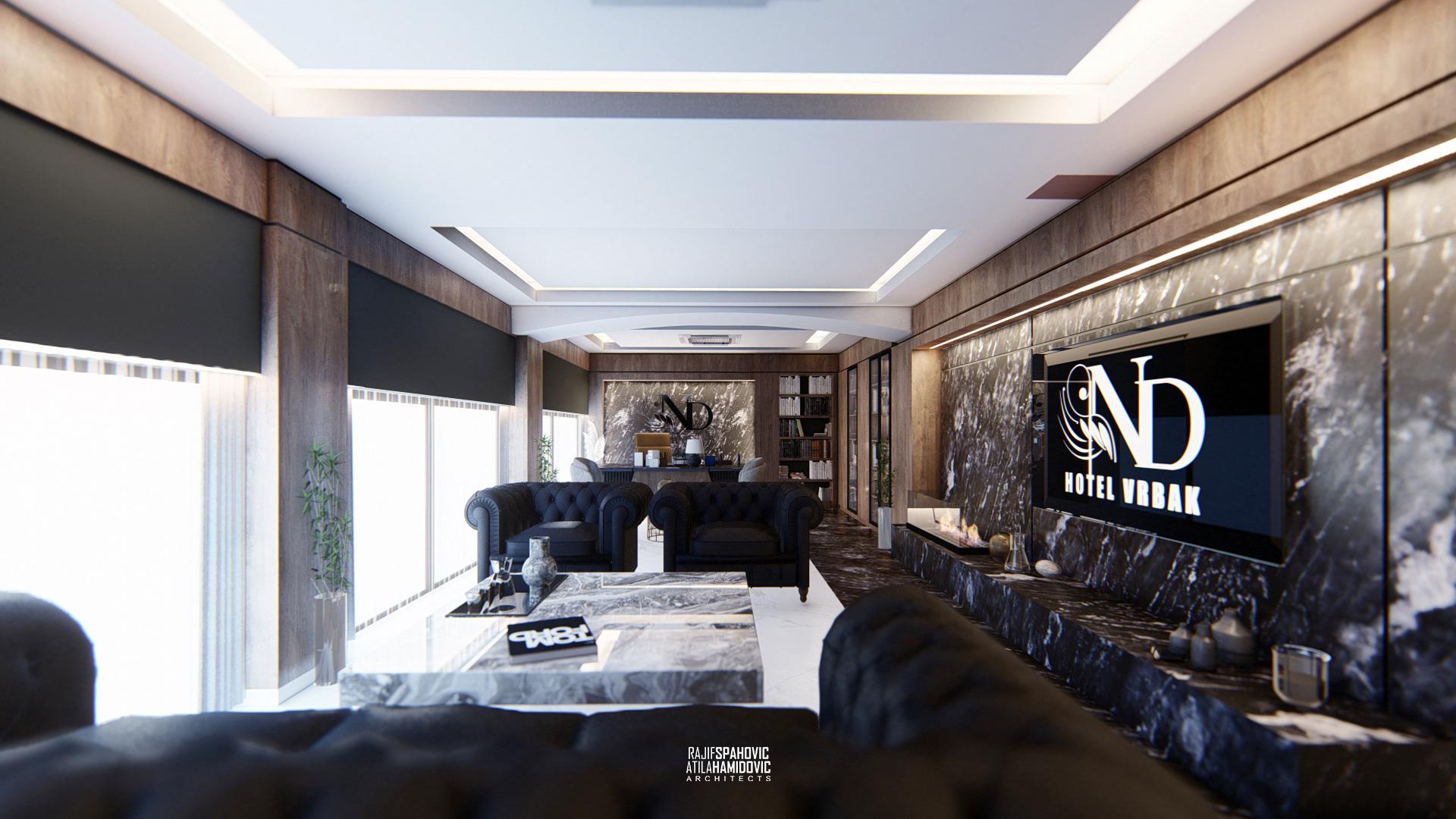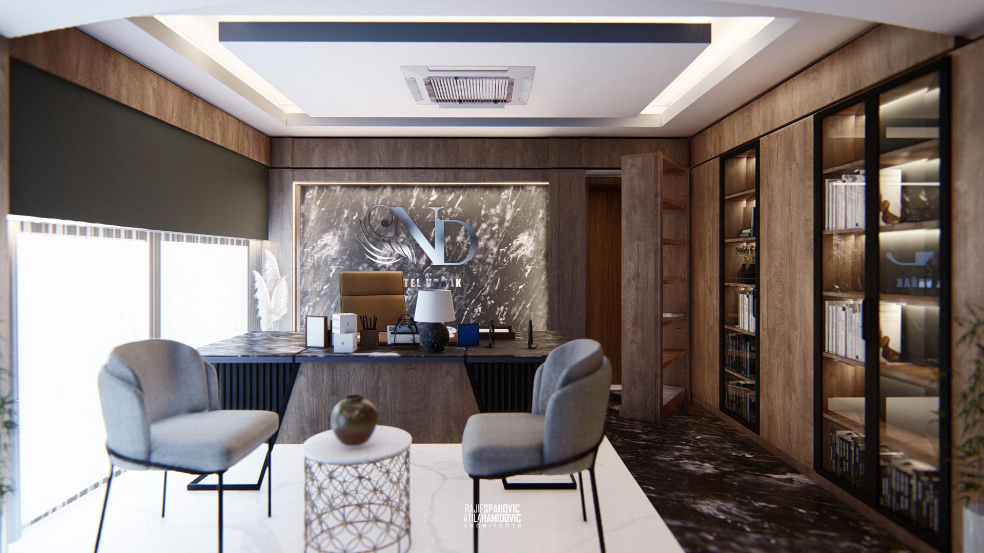 ND VRBAK is an office space of the city hotel ,,Vrbak'' located in the center part of Novi Pazar. It is designed in a modern style using contemporary materials of the interiors included wood, metal and stone.