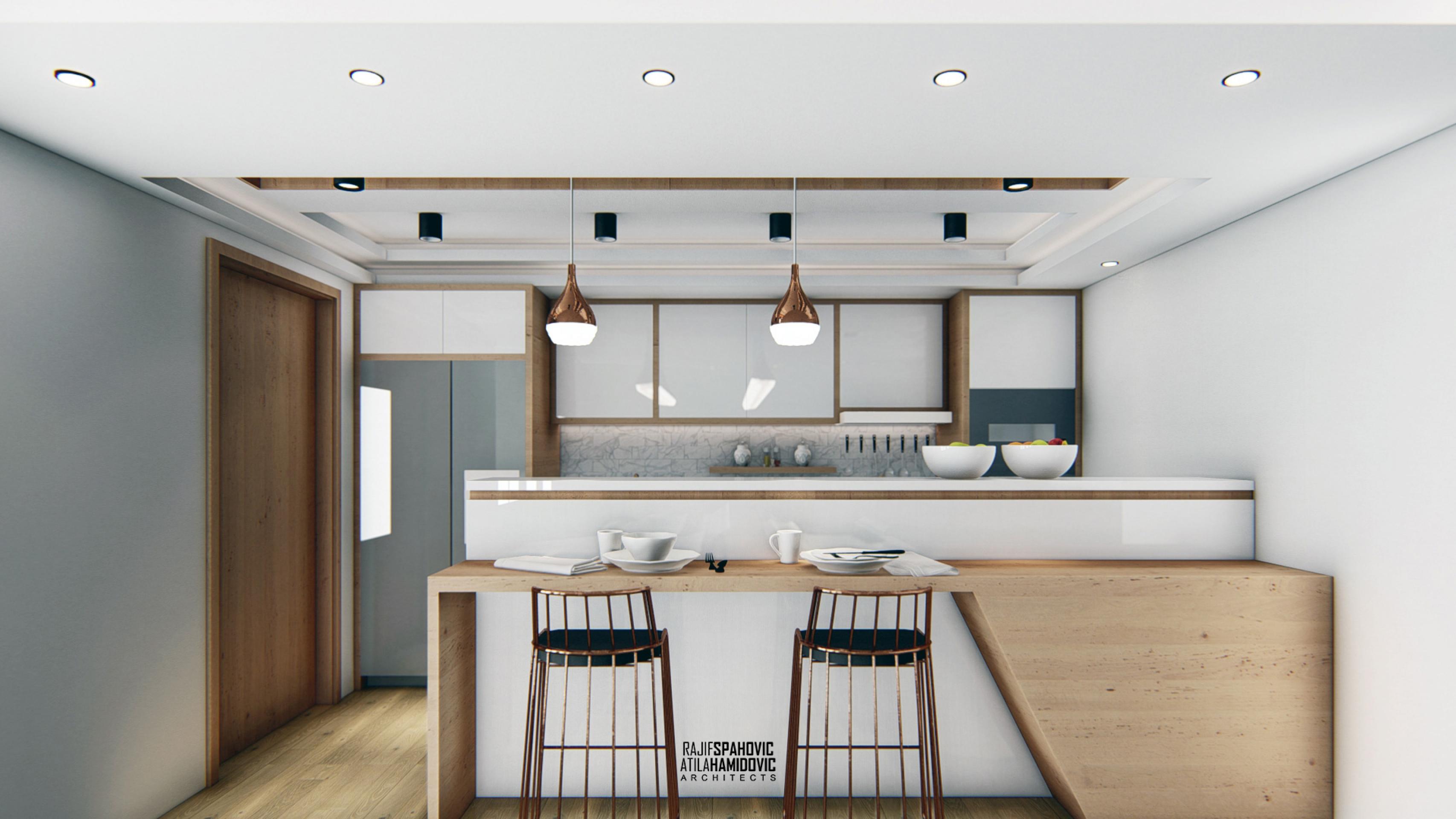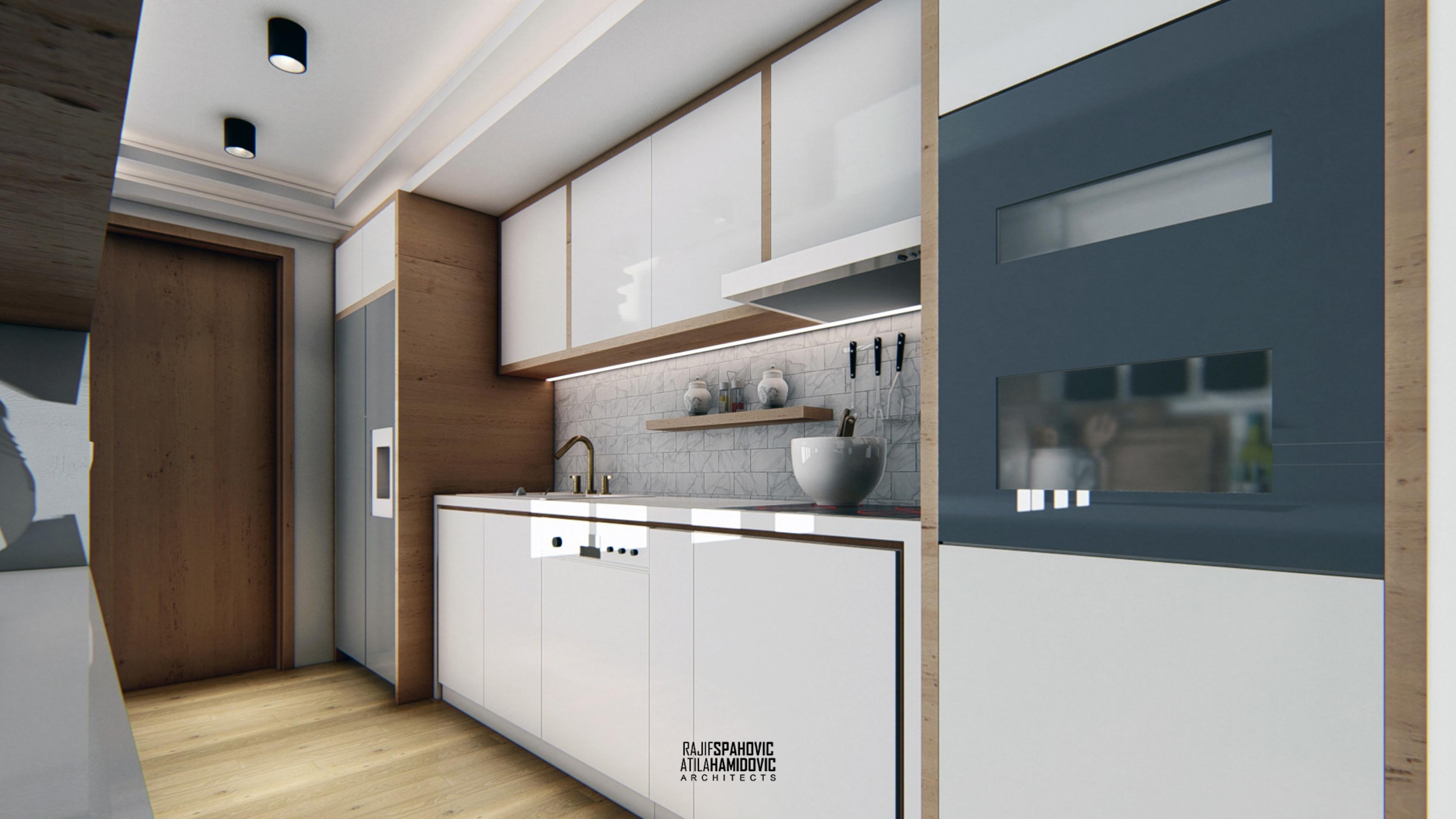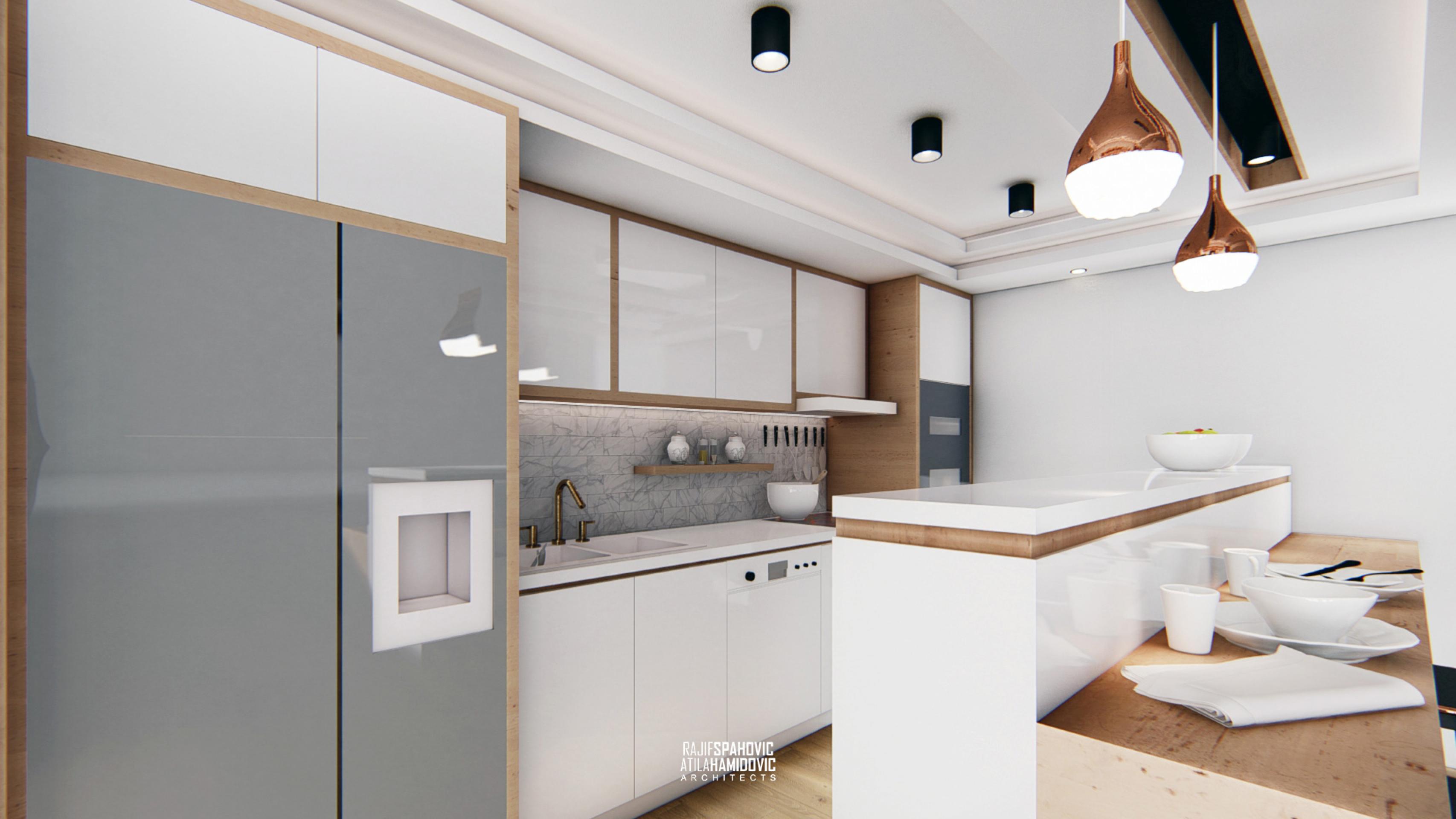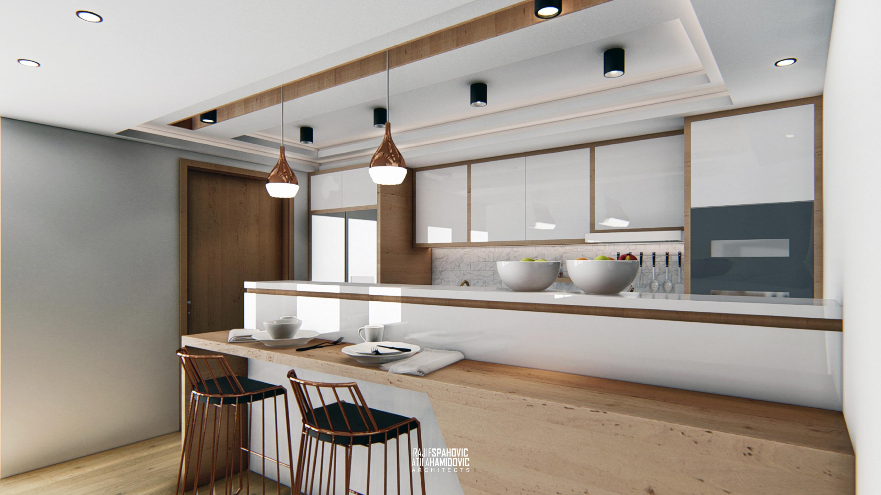 MRTZC | RESIDENTIAL is a buildings located in the center part of Novi Pazar. Ceiling and kitchen elements designed in a modern style using contemporary materials included oak wood and white shiny surfaces.