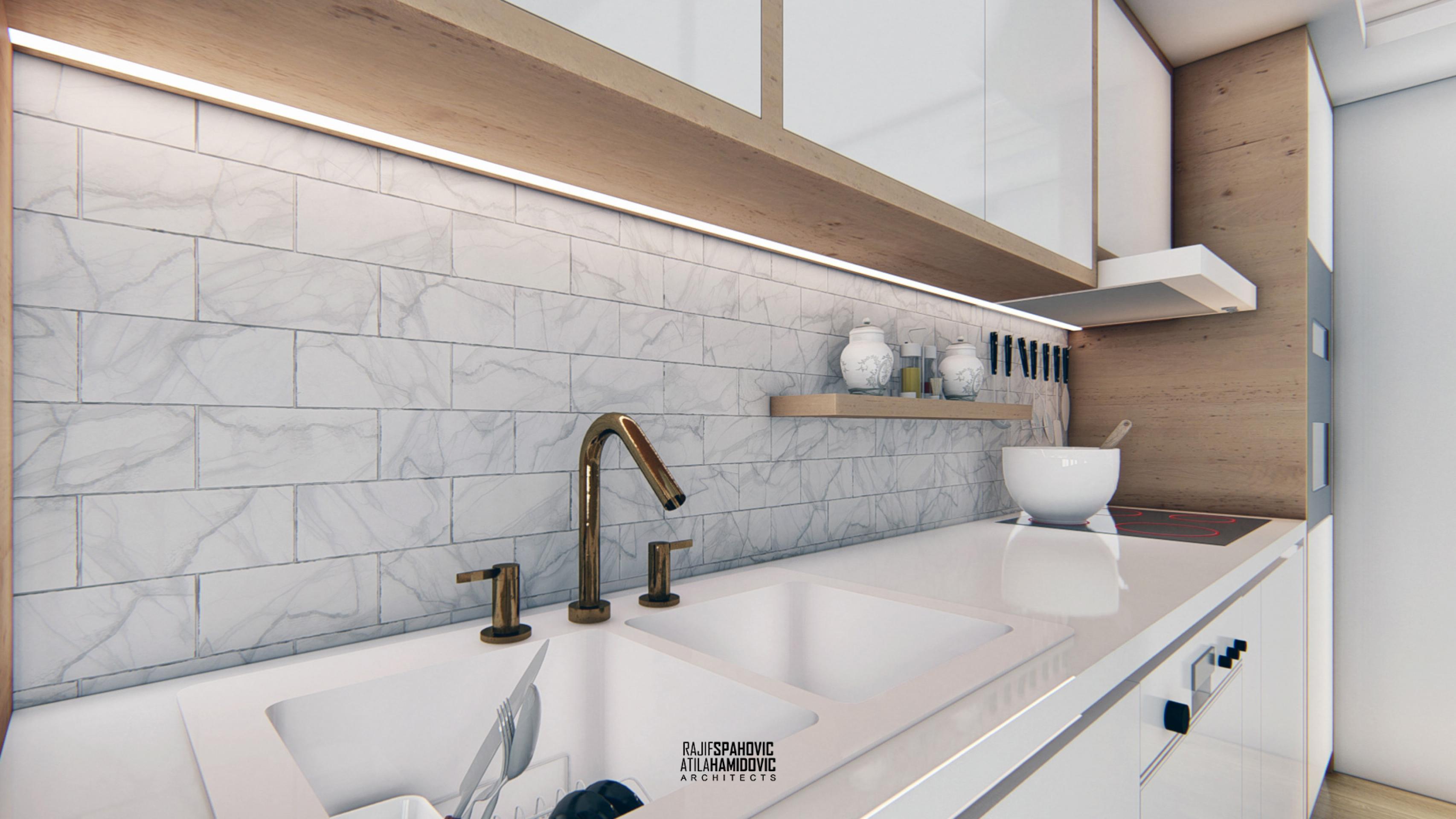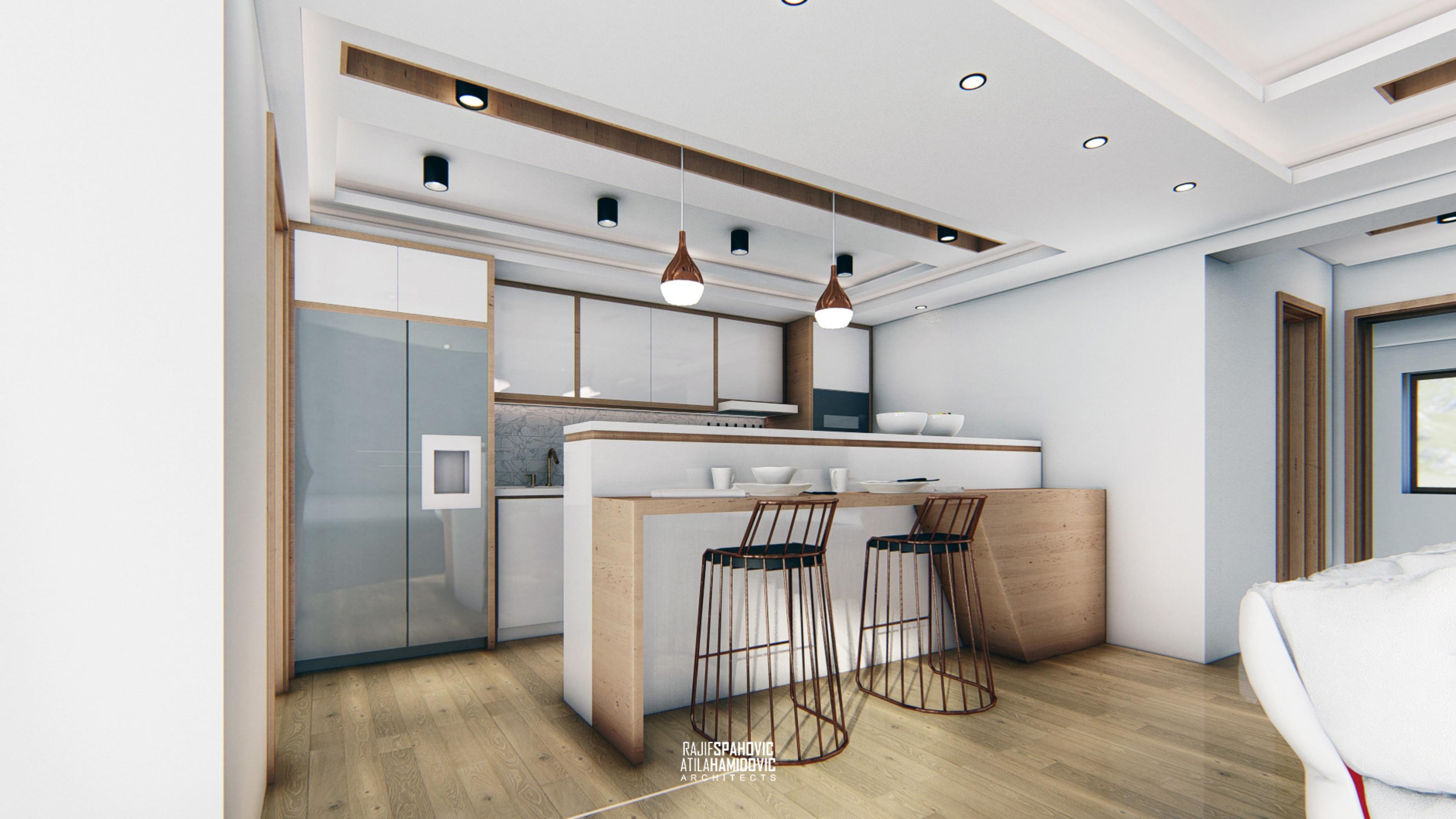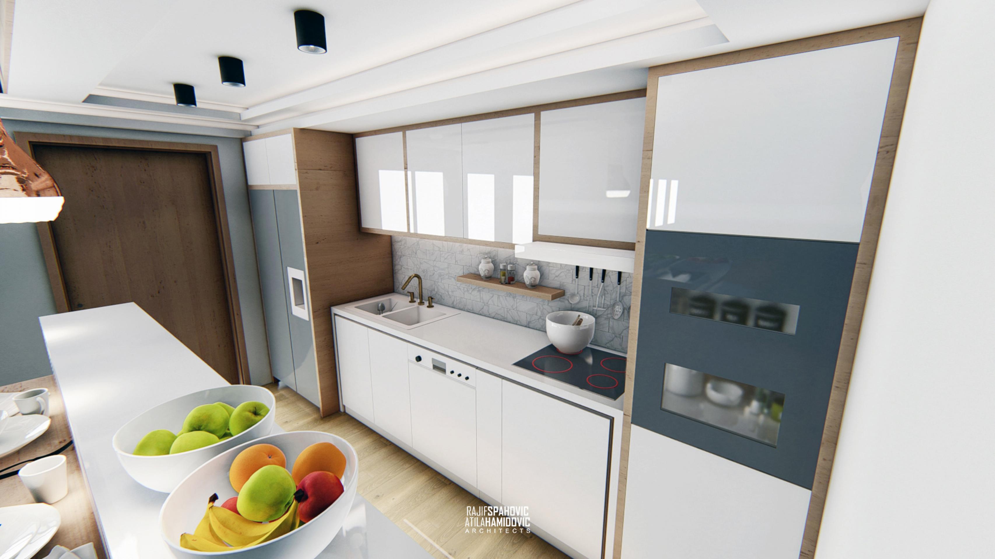 MRTZC | RESIDENTIAL is a buildings located in the center part of Novi Pazar. Ceiling and kitchen elements designed in a modern style using contemporary materials included oak wood and white shiny surfaces.