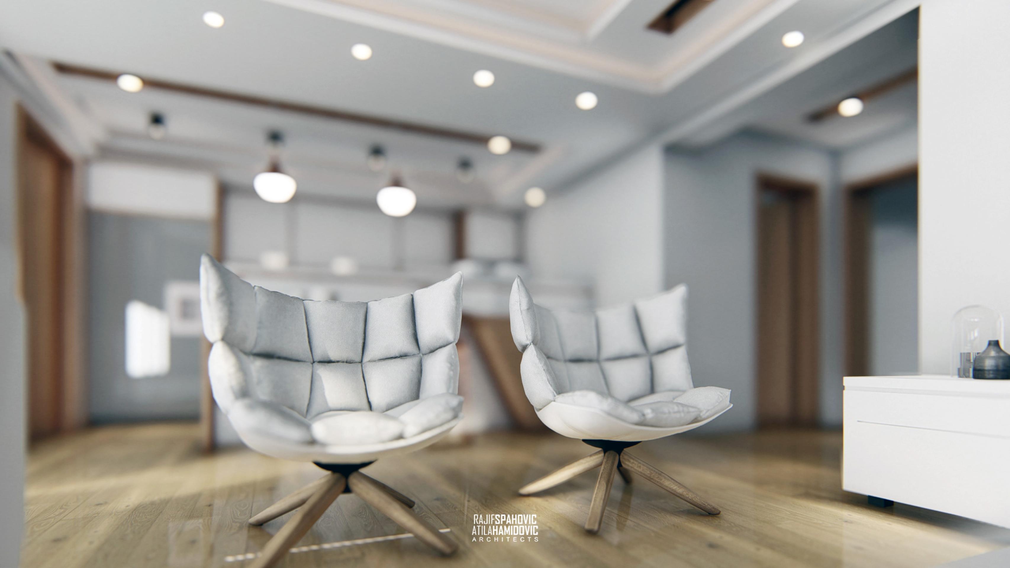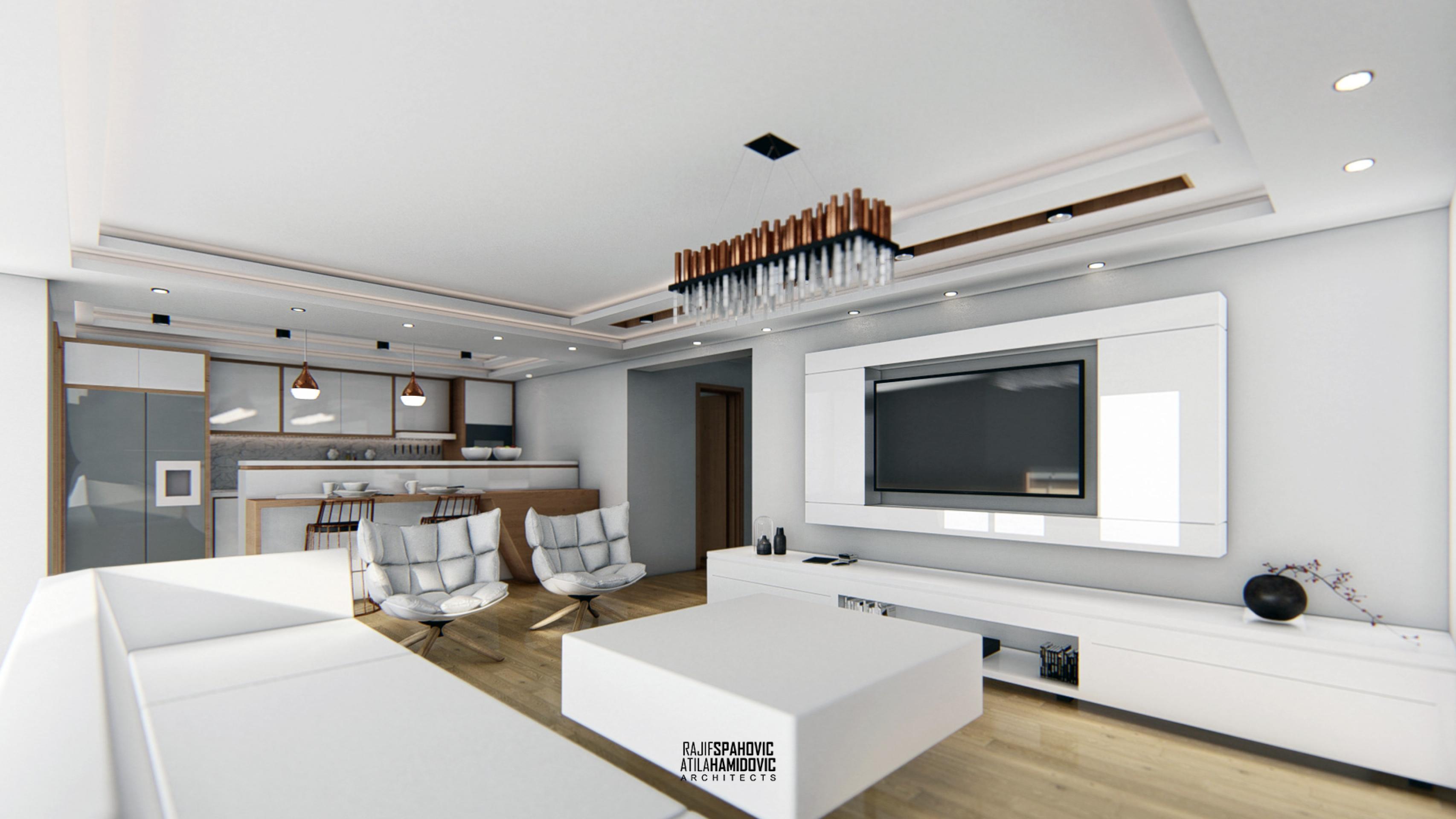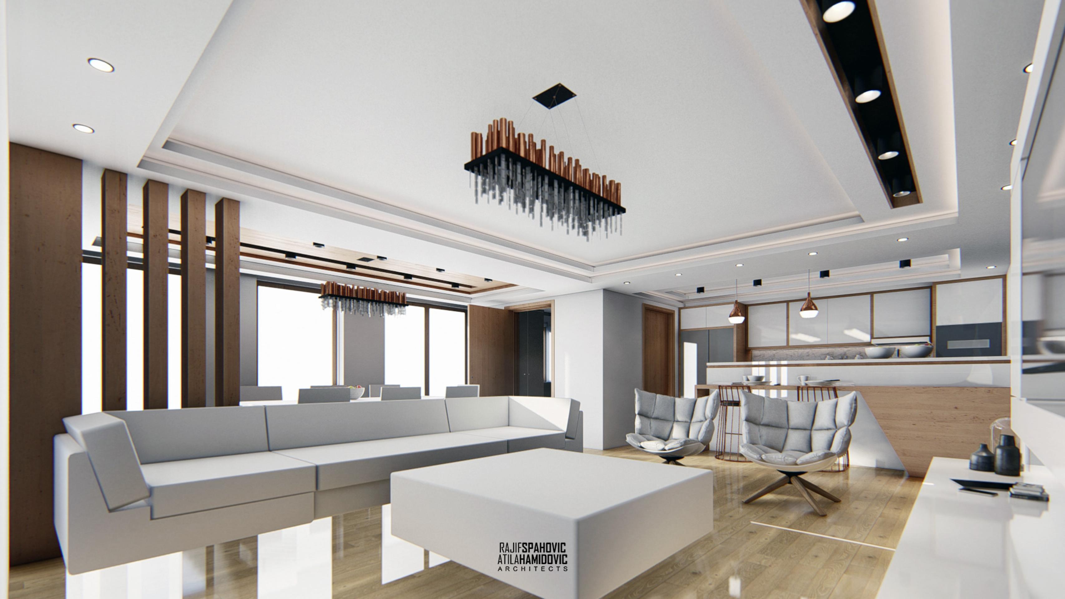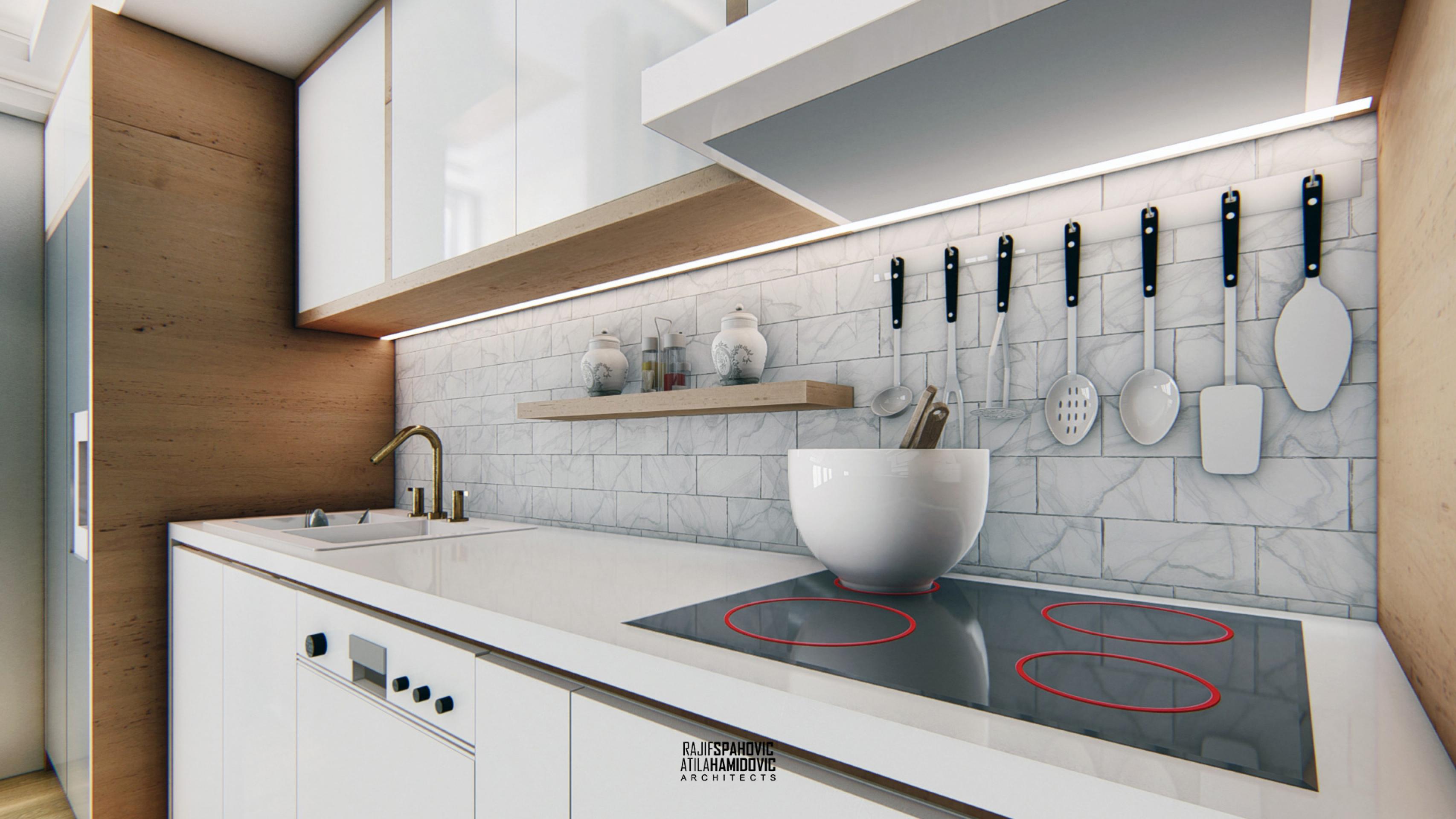 MRTZC | RESIDENTIAL is a buildings located in the center part of Novi Pazar. Ceiling and kitchen elements designed in a modern style using contemporary materials included oak wood and white shiny surfaces.